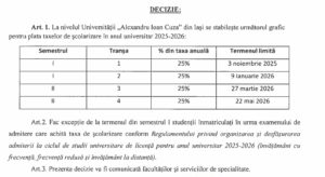 Stimați studenți, aveți mai jos calendarul pentru plata taxelor de școlarizare, hotărâre a Senatului Universității, calendar aplicat în anul universitar 2025/2026.