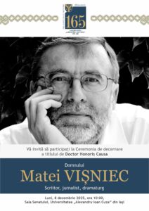 Ceremonia de decernare a titlului de Doctor Honoris Causa al UAIC domnului Matei Vișniec, scriitor, jurnalist și dramaturg, care va avea loc luni, 8 decembrie 2025, la ora 10:00, în Sala Senatului (informațiile de aici: https://www.uaic.ro/event/ceremonia-de-decernare-a-titlului-de-doctor-honoris-causa-al-uaic-domnului-matei-visniec-scriitor-jurnalist-si-dramaturg);