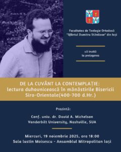 Miercuri, Facultatea noastră îl găzduiește pe prof. dr. David A. Michelson, specialist în istoria creștinismului siriac, care va susține conferința „De la cuvânt la contemplație: lectura duhovnicească în mănăstirile Bisericii Siro-Orientale (400–700 d.Hr.). Putem vorbi de o lectio divina siriacă?”