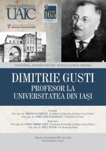 Universitatea „Alexandru Ioan Cuza” din Iași (UAIC) organizează miercuri, 29 octombrie 2025, la ora 14:30, în Sala „Ferdinand” a UAIC, Conferința „Dimitrie Gusti, profesor la Universitatea din Iași”.