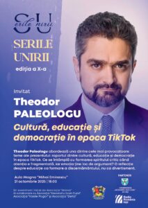 Serile Unirii, ediția a X-a: Conferința „Cultură, educație și democrație în epoca TikTok”, susținută de Theodor Paleologu, marți, 21 octombrie 2025, ora 18:00, în Aula Magna „Mihai Eminescu”.