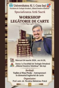 În data de 4.03.2026, la ora 14, 30, în Anexa 1 a Facultății de Teologie Ortodoxă „Sf. Dumitru Staniloae” s-a desfășurat  un workshop de legătorie de carte, având ca invitați doi antreprenori în acest domeniu,  Vadim și Nina Preda. In cadrul workshopului cei doi invitati au lucrat împreună cu studenții și au realizat agende, parcurgând pas cu pas procesul de legătorie: pregătirea foilor, coaserea blocului de carte și realizarea copertei.